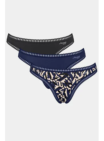 Výhodné balení tří kusů tang je ideální na každodenní nošení. Bavlněná tanga v modré, černé a vzorované variantě zdobí jemné kontrastní lemování, které jim dodává elegantní vzhled. Vykouzlí neodolatelné pozadí a zajistí pohodlí při nošení.