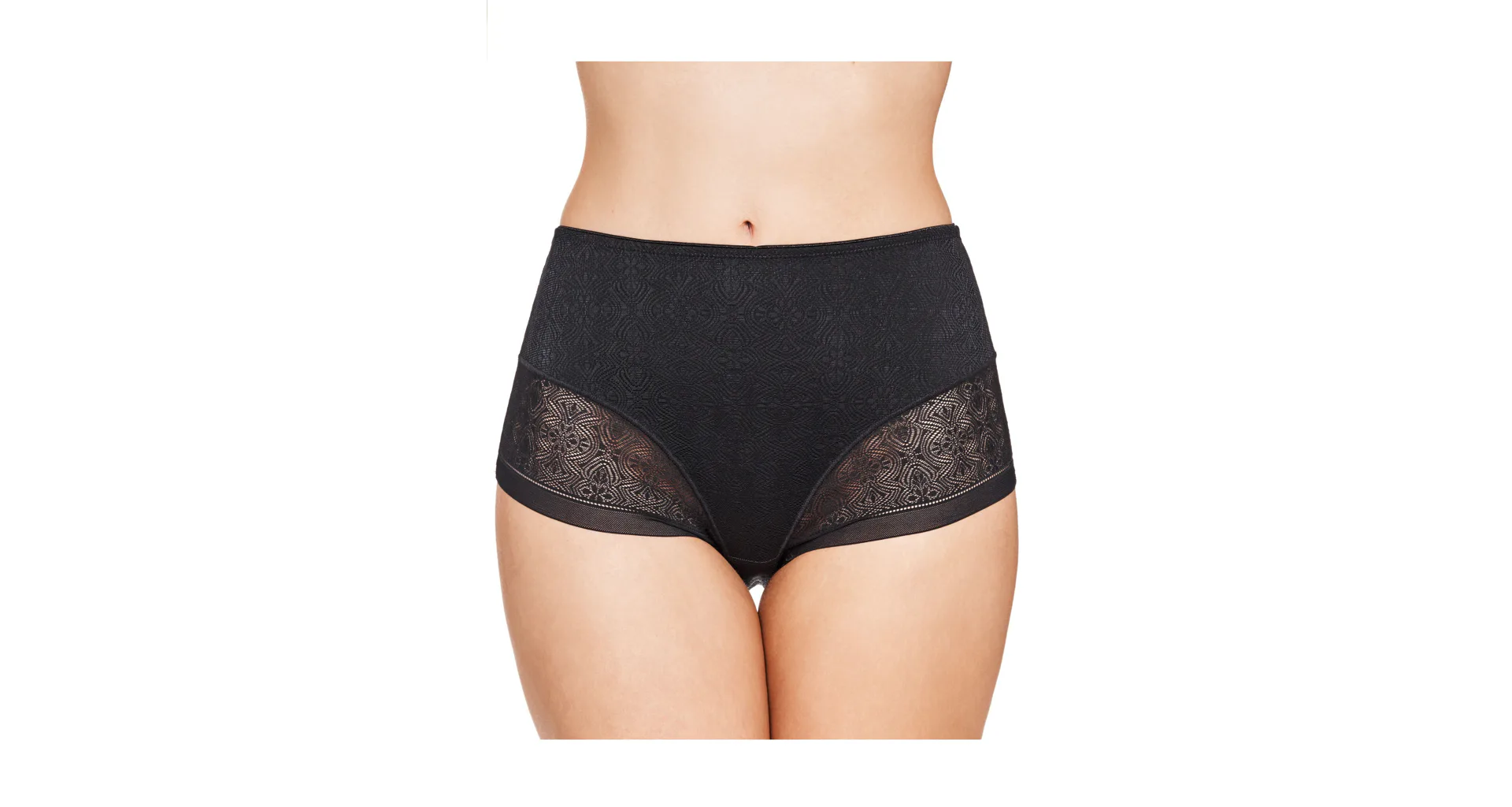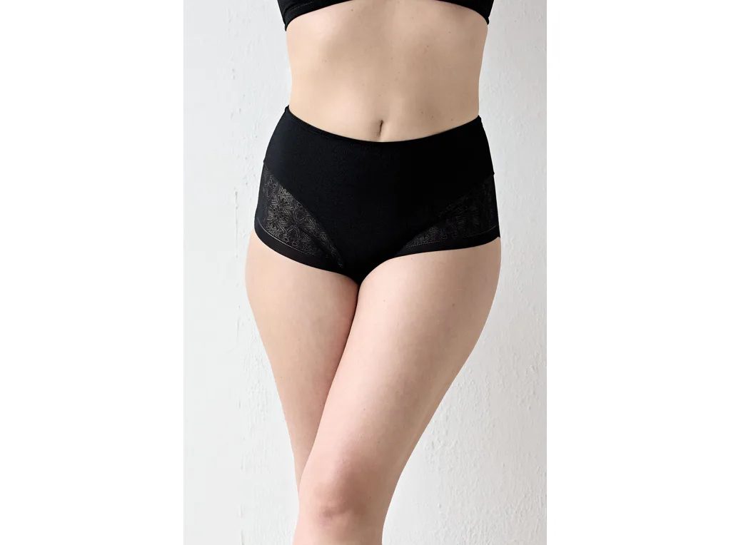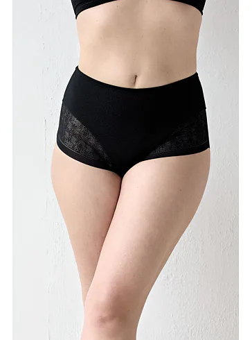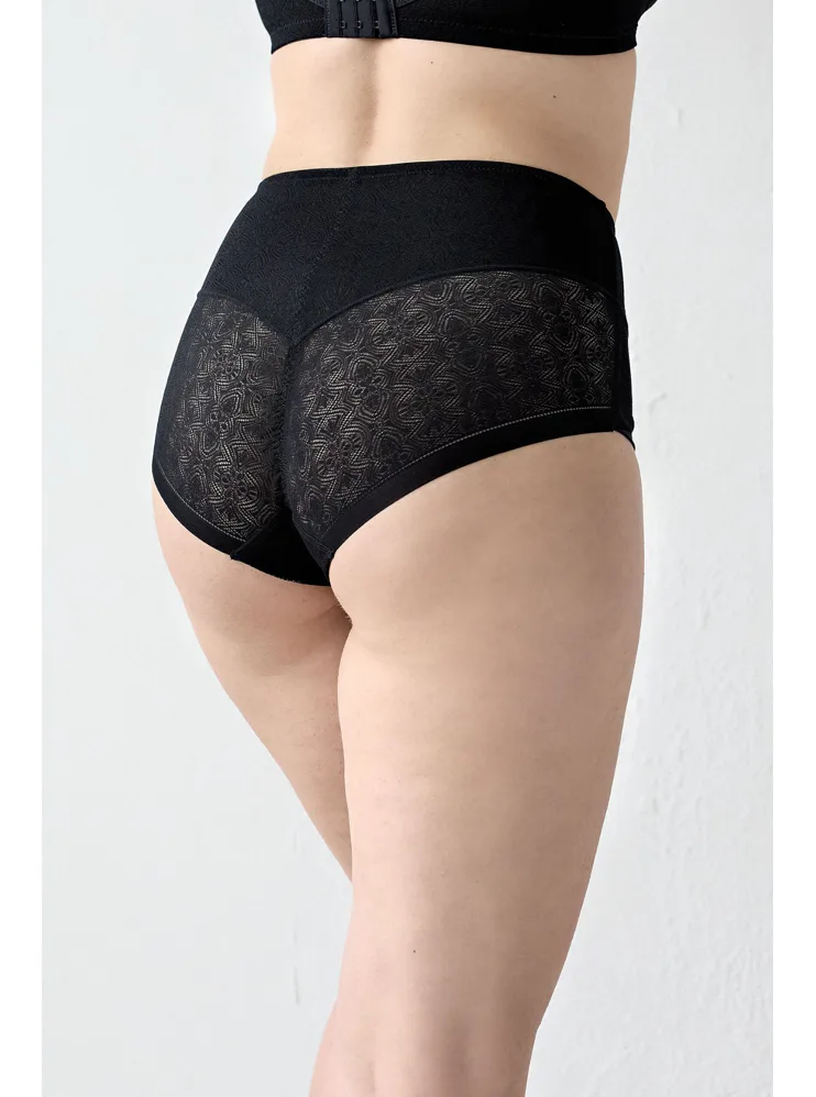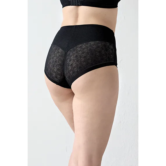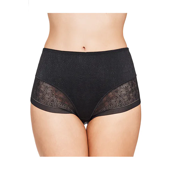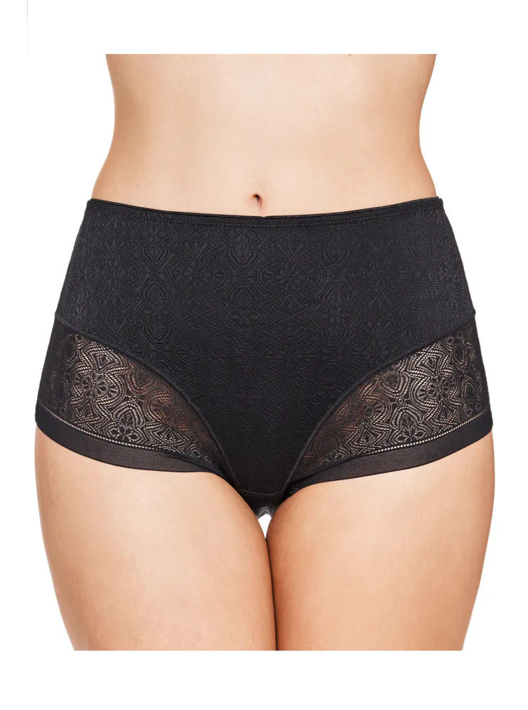 Černé stahovací kalhotky se zvýšeným pasem mají formující efekt, vykouzlí krásnou siluetu a zajistí hladký a přirozený vzhled pod upnutým oblečením. Šev do tvaru Y v zadní části opticky vytvaruje zadeček a zvýrazní křivky. Elegantní krajka zdobí přední i zadní díl kalhotek. Samozřejmostí je zesílený bavlněný klín pro zajištění maximálního komfortu. Formující kalhotky můžete pořídit i v tělové barvě.