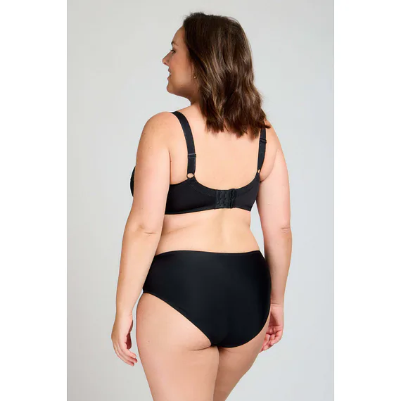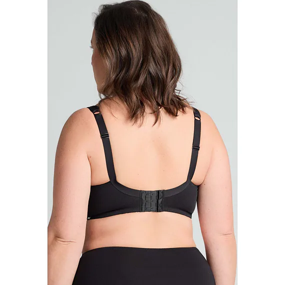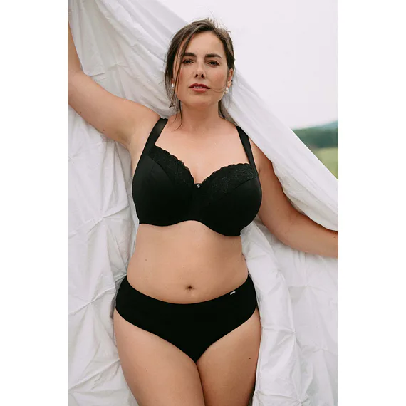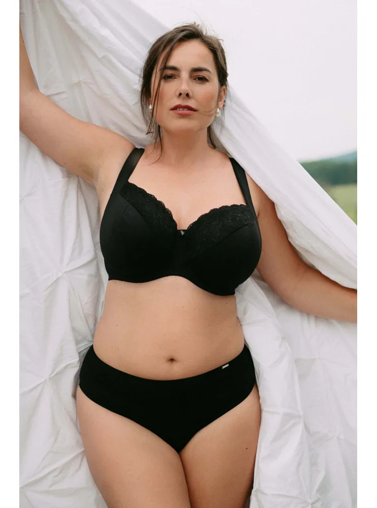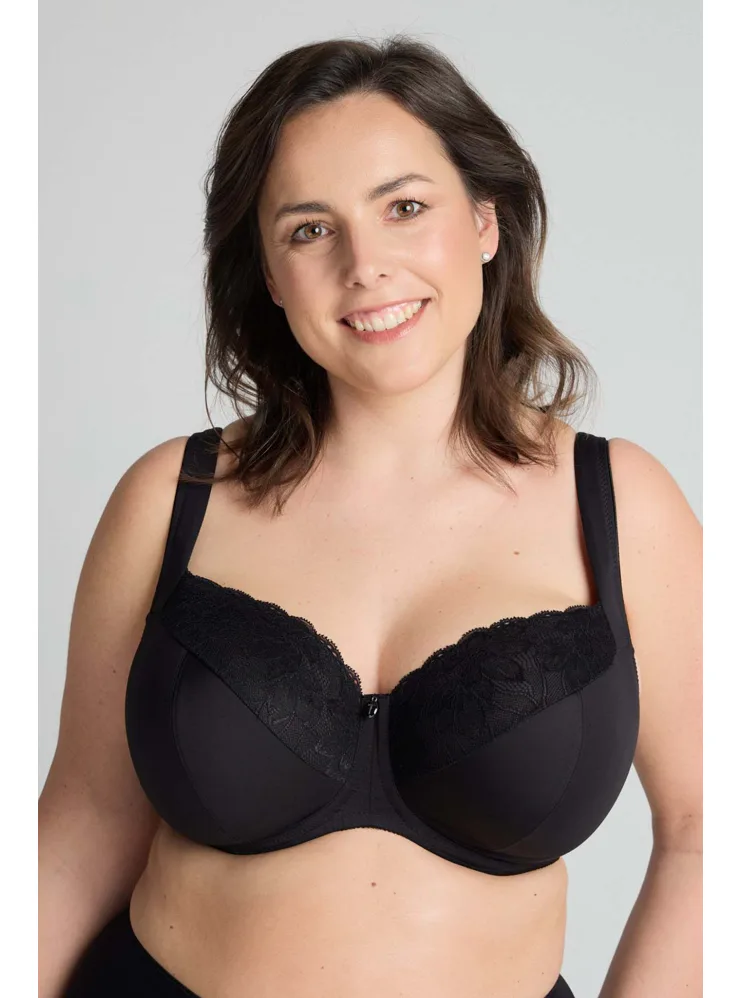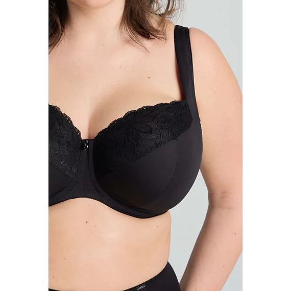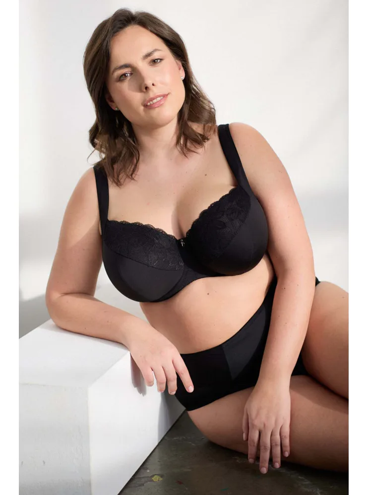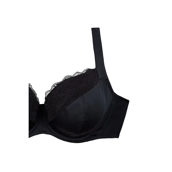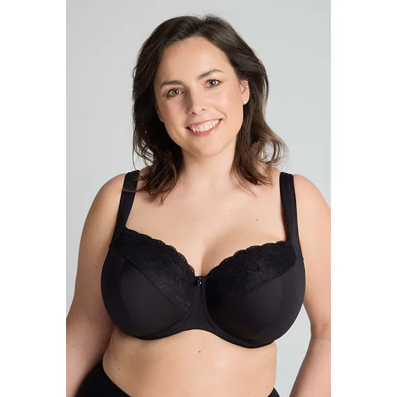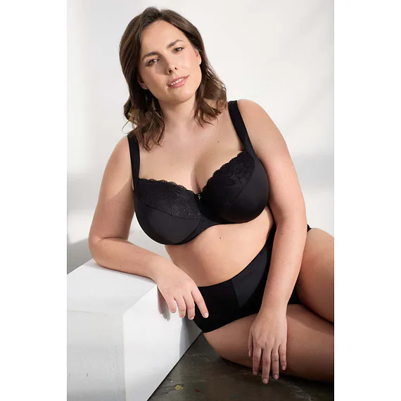 Černá podprsenka ve střihu Comfy-Fit je ideální pro velká a těžká prsa. Krajka ve výstřihu zakryje případnou asymetrii. Zadní díl je vyroben z pevného, funkčního úpletu. Pohodlná, měkce podložená ramínka lze nastavit dle potřeby. Podprsenka prsa zafixuje na středu a přizpůsobí se každému pohybu.