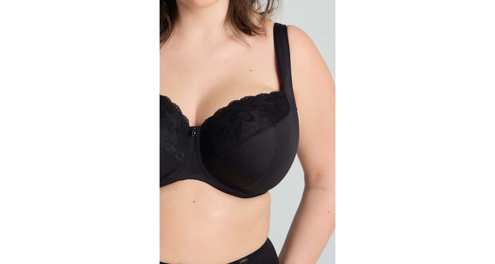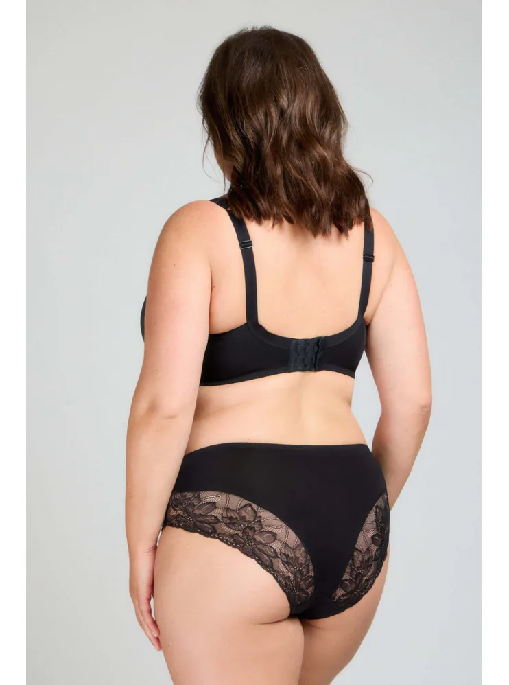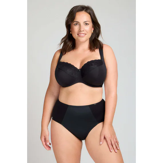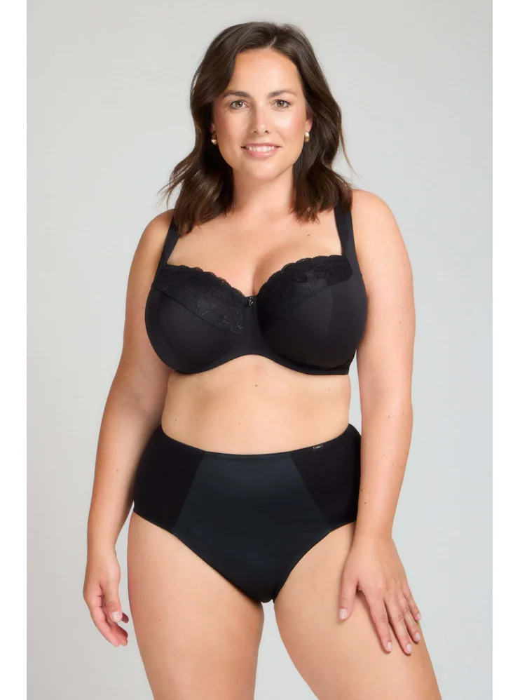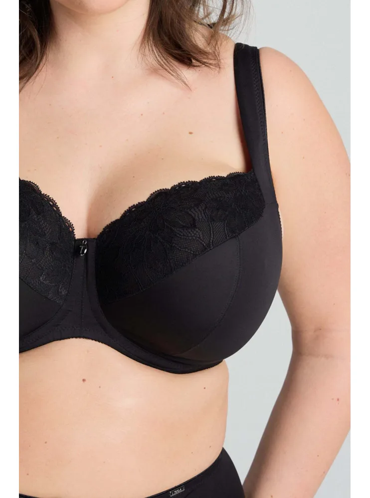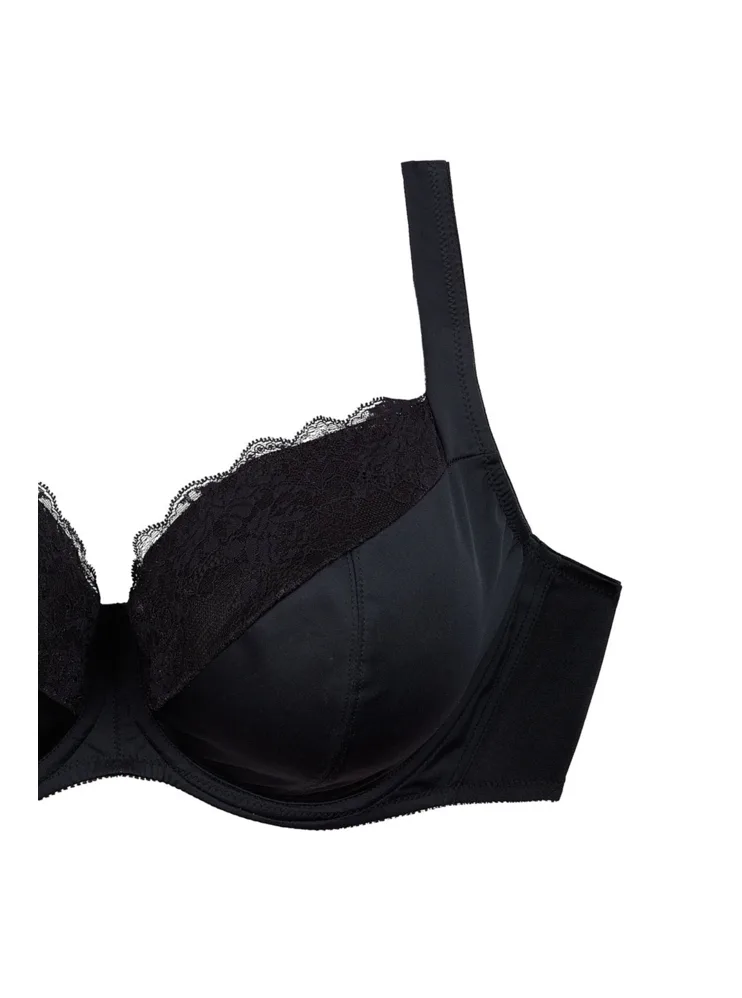 Černá podprsenka ve střihu Comfy-Fit je ideální pro velká a těžká prsa. Krajka ve výstřihu zakryje případnou asymetrii. Zadní díl je vyroben z pevného, funkčního úpletu. Pohodlná, měkce podložená ramínka lze nastavit dle potřeby. Podprsenka prsa zafixuje na středu a přizpůsobí se každému pohybu.