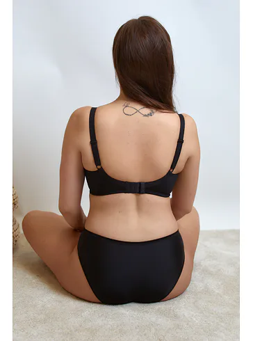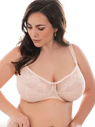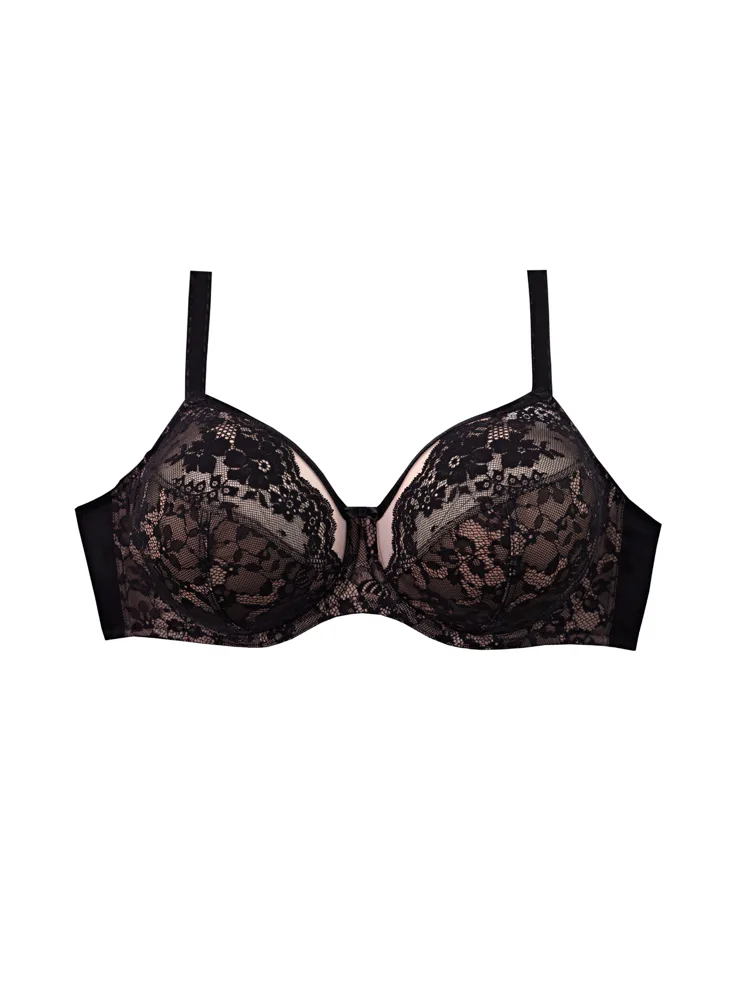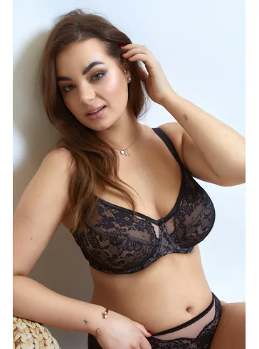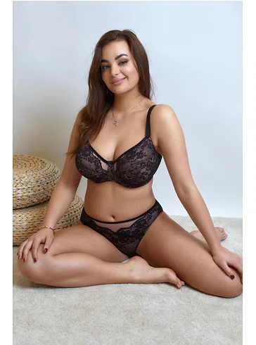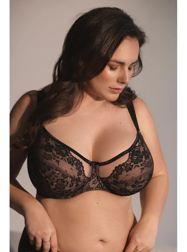 Nevyztužená podprsenka s kosticemi je zdobena černou krajkou na nugátovém podkladu. Zafixuje a vytvaruje velká a těžká prsa. Zdůrazní přirozený tvar vašich ňader a zaručí maximální pohodlí. Ideální pro každodenní nošení.