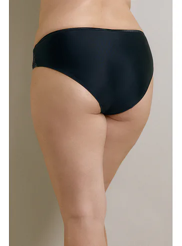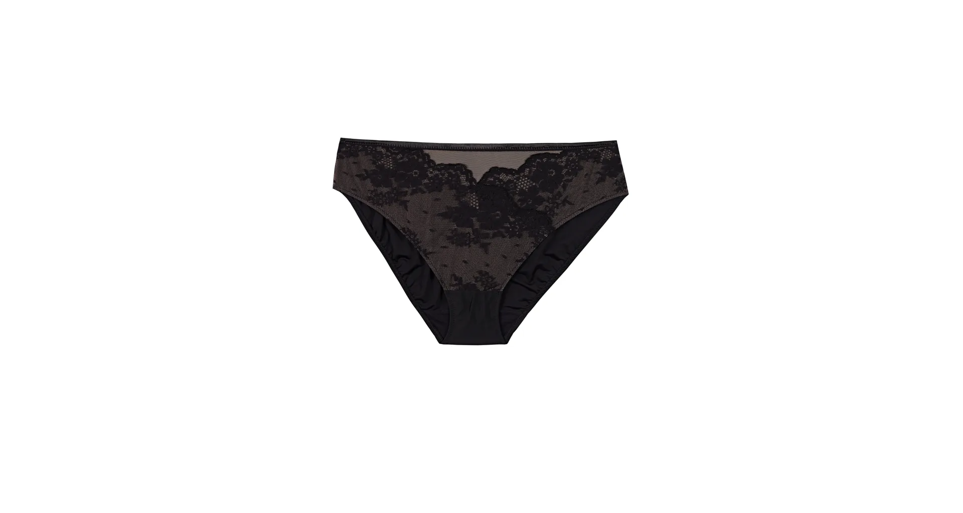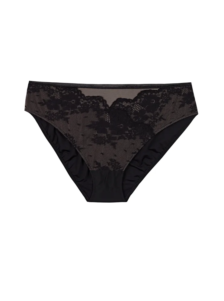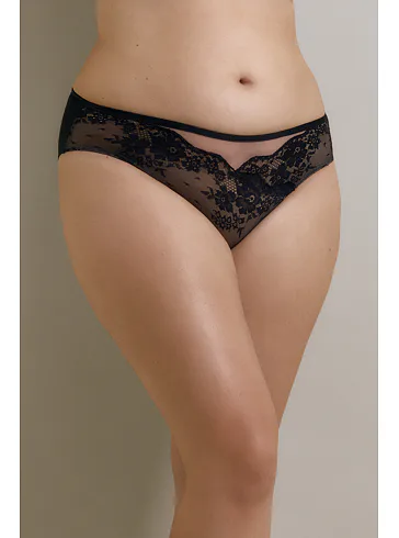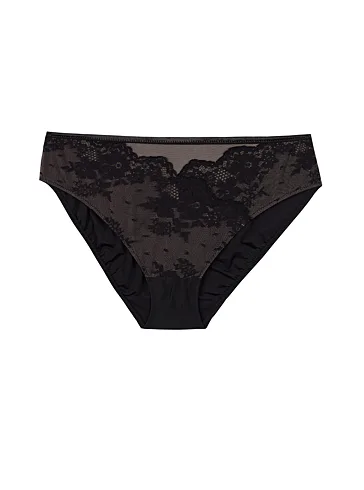 Dámské klasické kalhotky vás uchvátí černou rafinovanou krajkou s květinovým motivem na nugátovém podkladu. Zadní díl kalhotek je hladký. Univerzální klasický střih lichotí každé postavě a poskytuje plné krytí zadečku a boků.