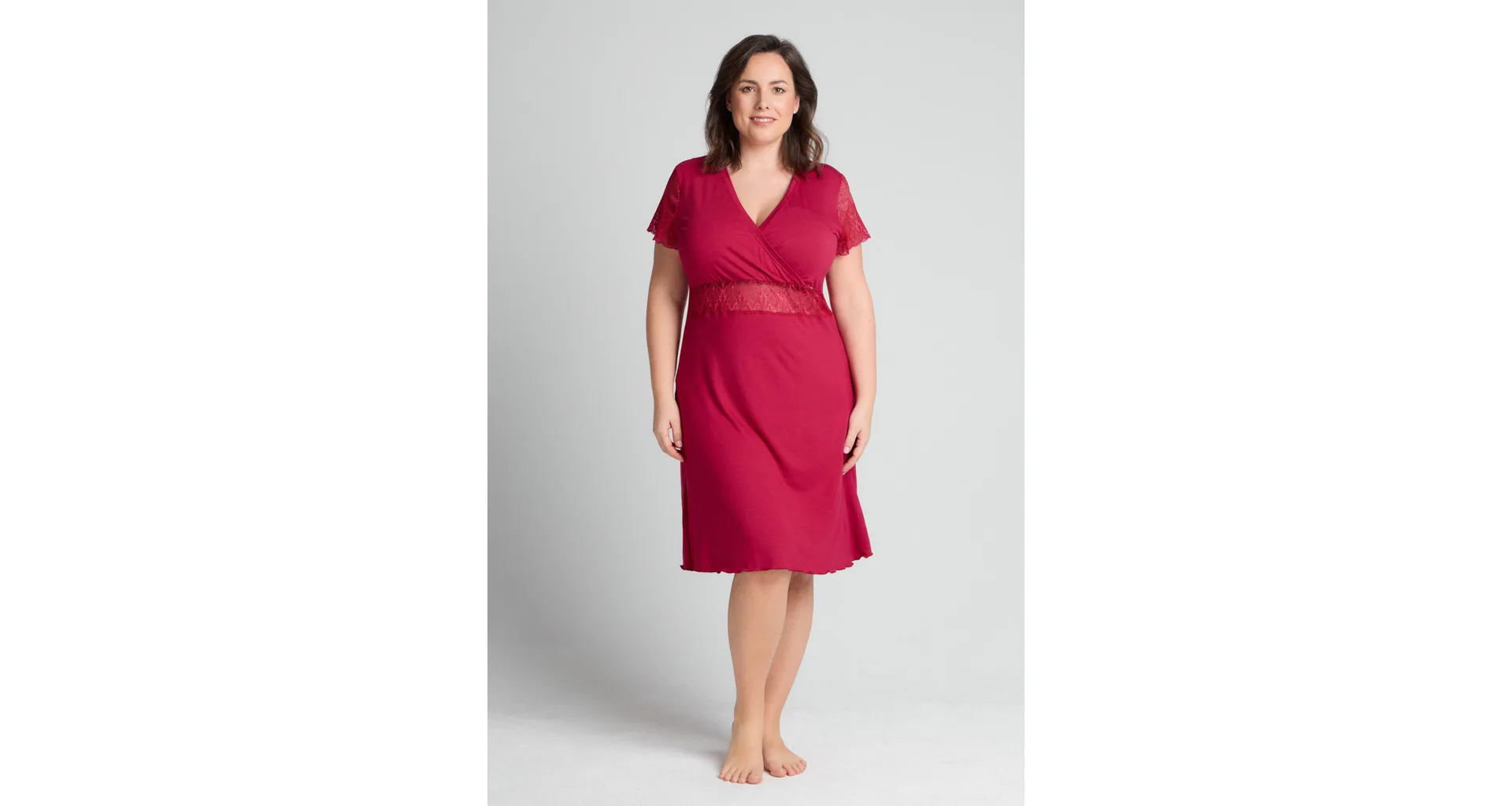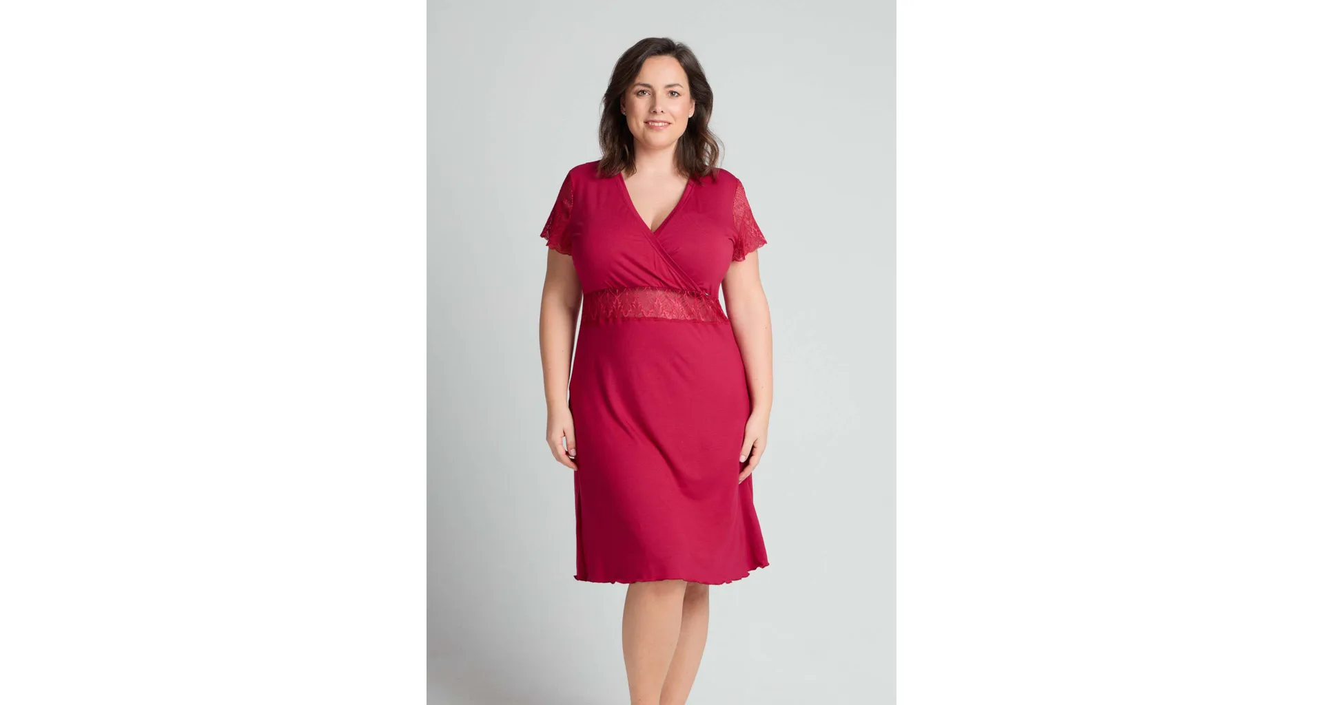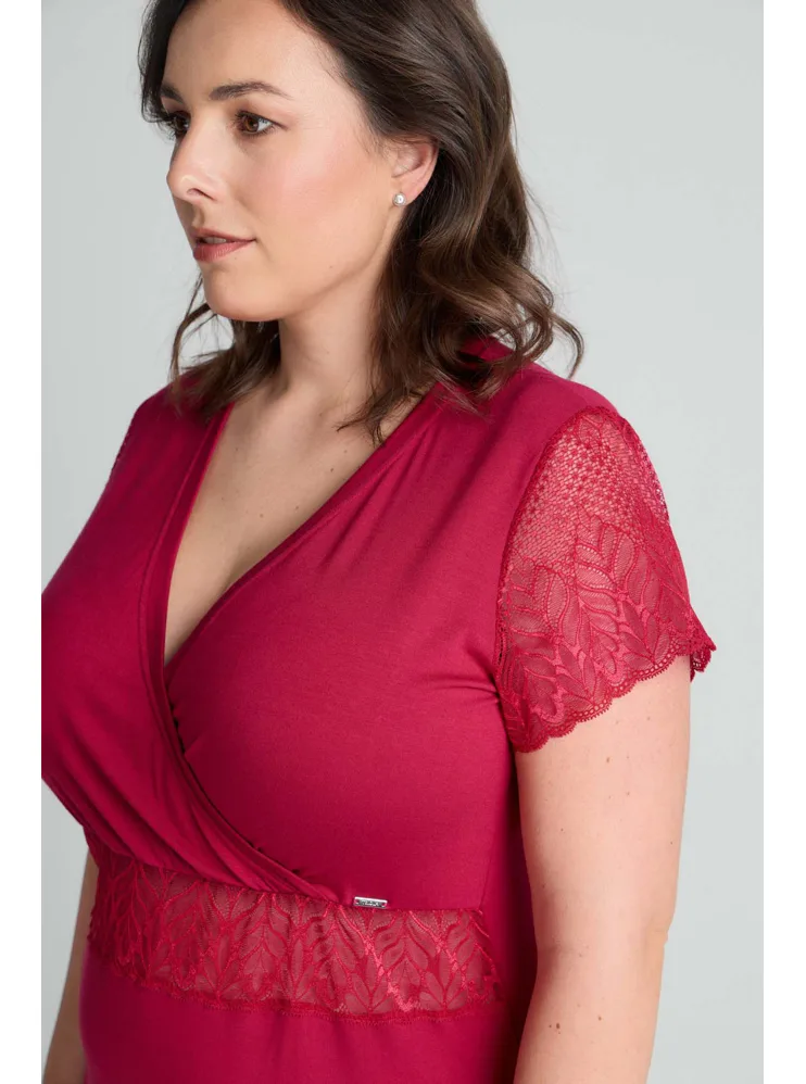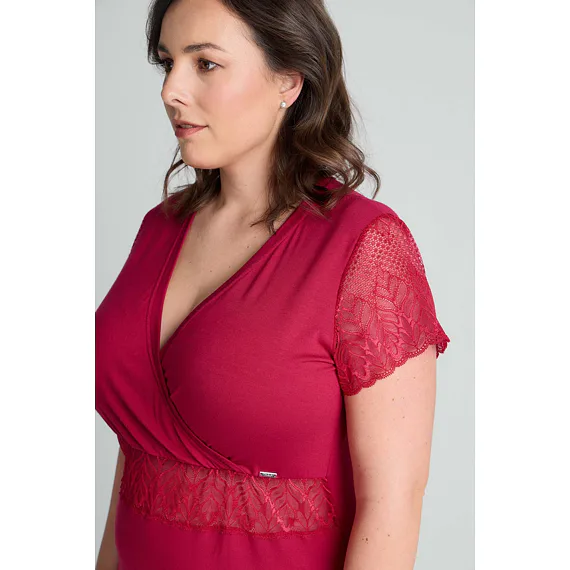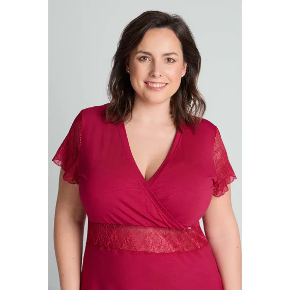 Usínejte a probouzejte se v měkké a splývavé noční košili, která je vyrobena z modalového vlákna. Červená košile zaujme jemnou krajkou pod prsy a na rukávech. Oblíbený střih s křížením ve výstřihu lichotí postavě a působí elegantně.