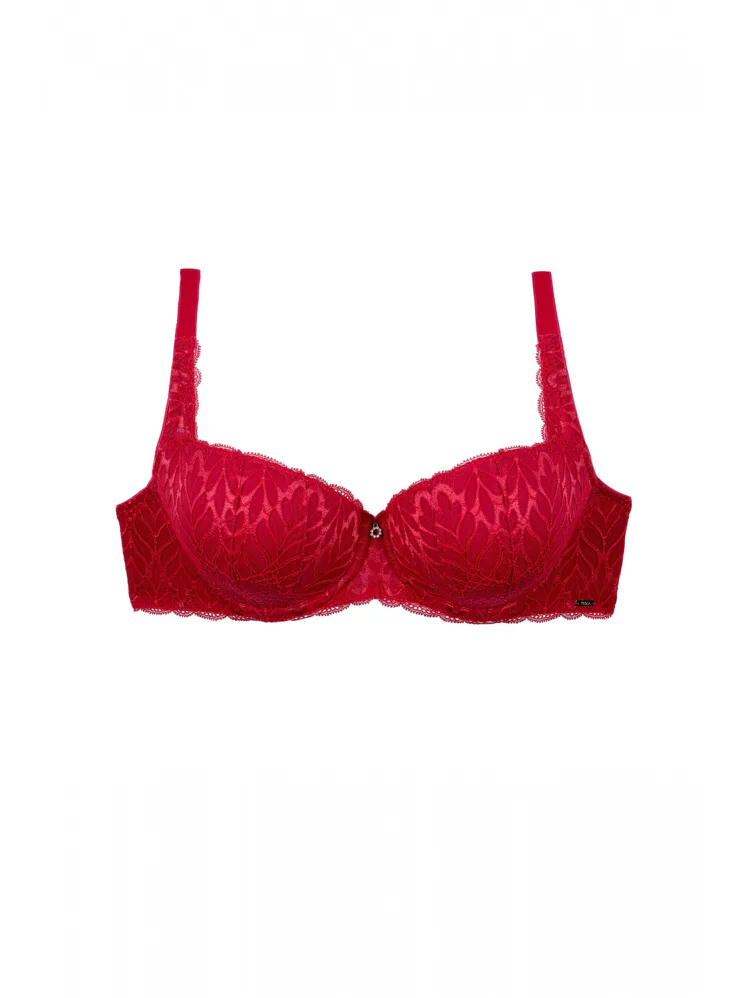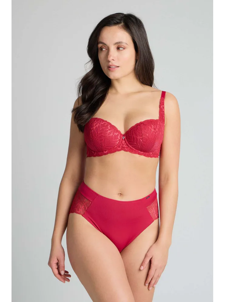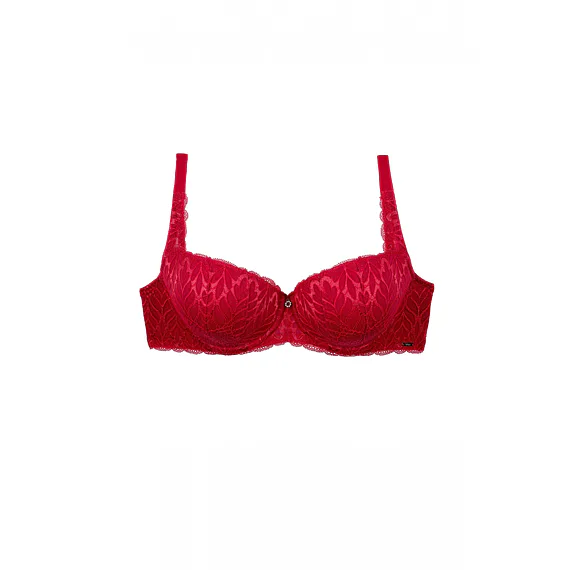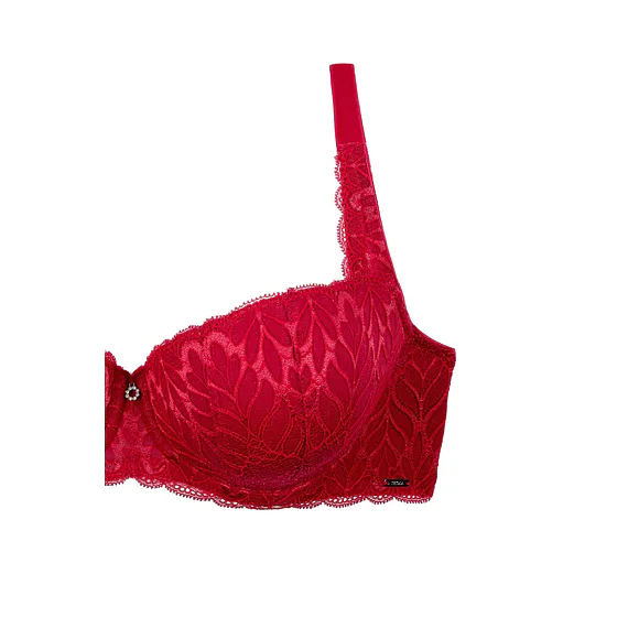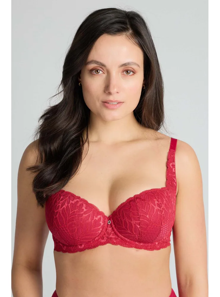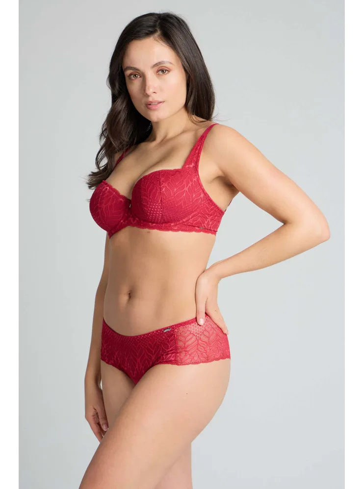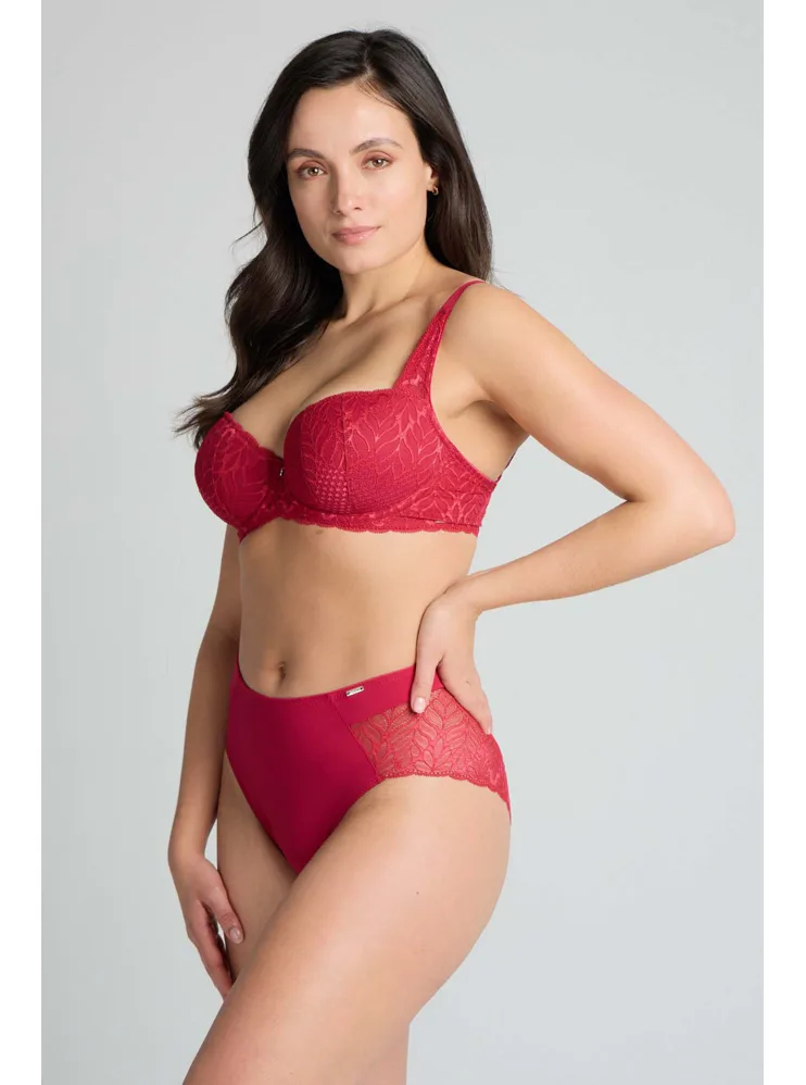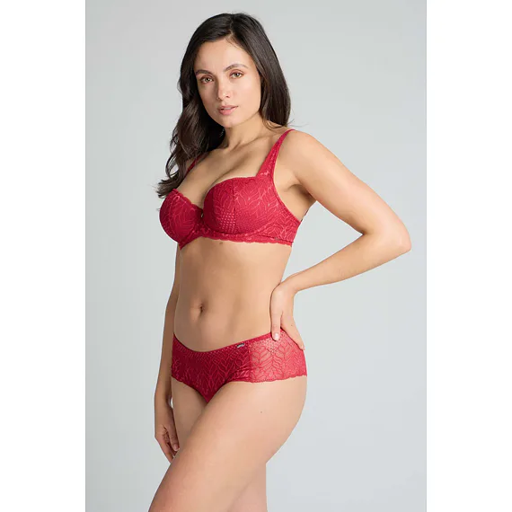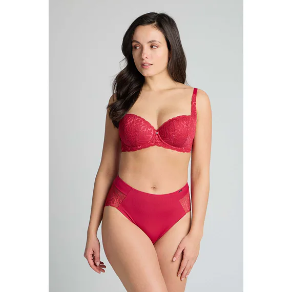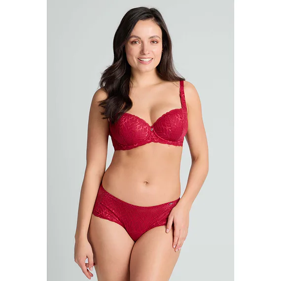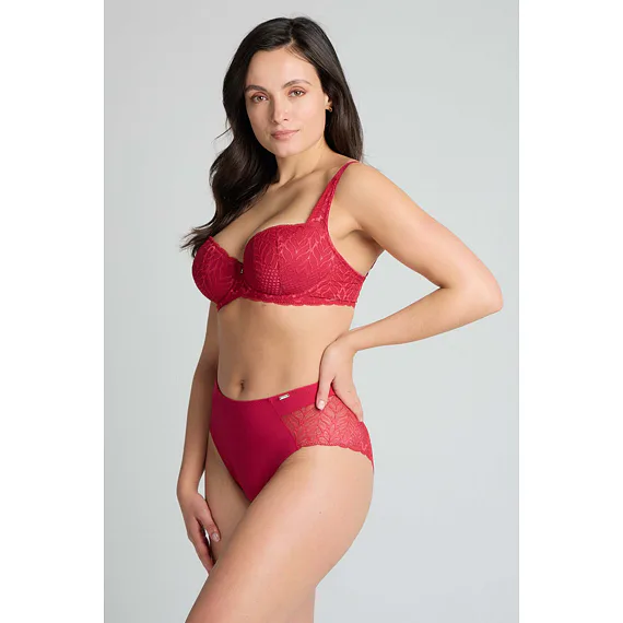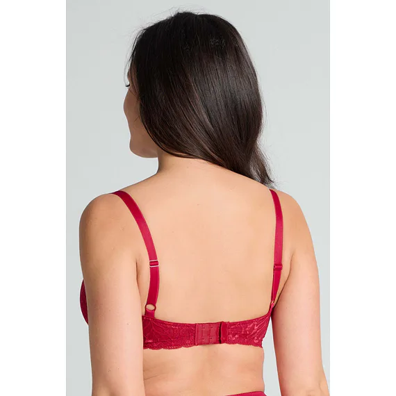 Podprsenka ve střihu balconette vytvoří hluboký a neodolatelný dekolt. Uchvátí luxusní krajkou s bohatým vzorem a temným odstínem červené barvy. Zajistí spolehlivou oporu a přizpůsobí se každému vašemu pohybu. Dokonalá volba pro každý den.