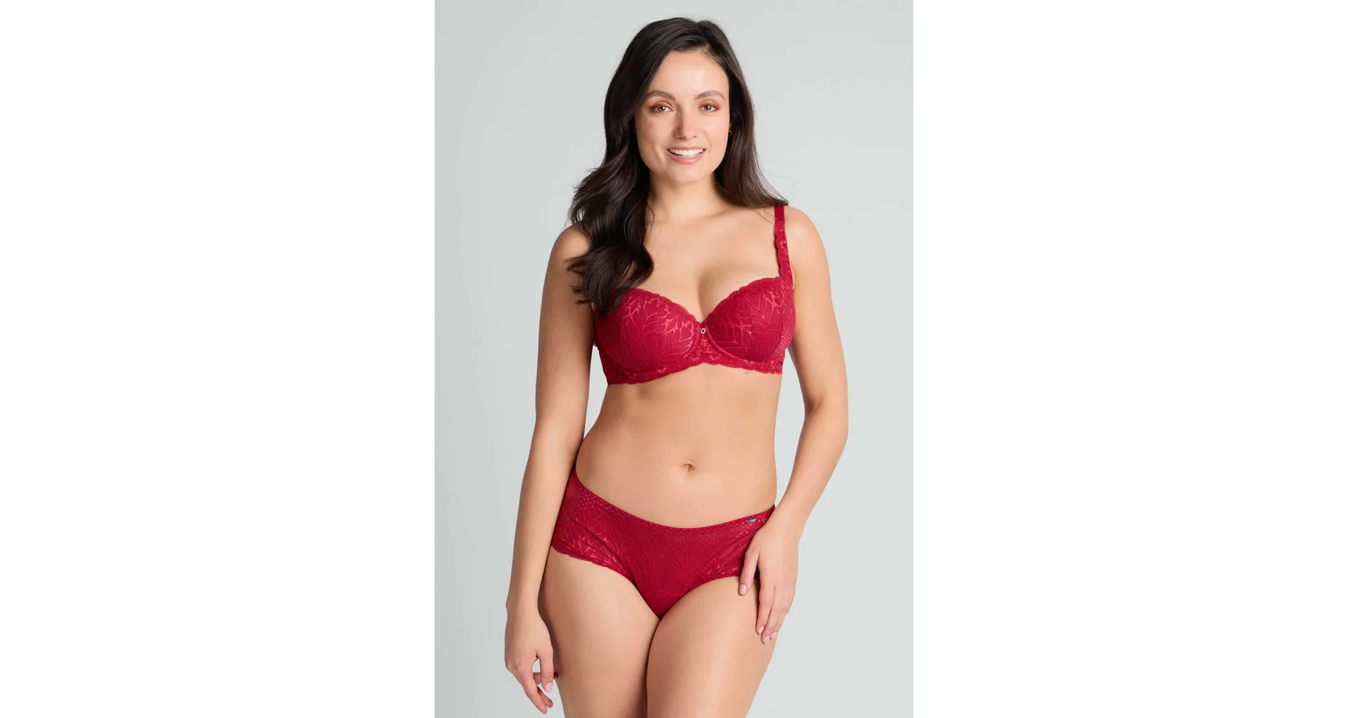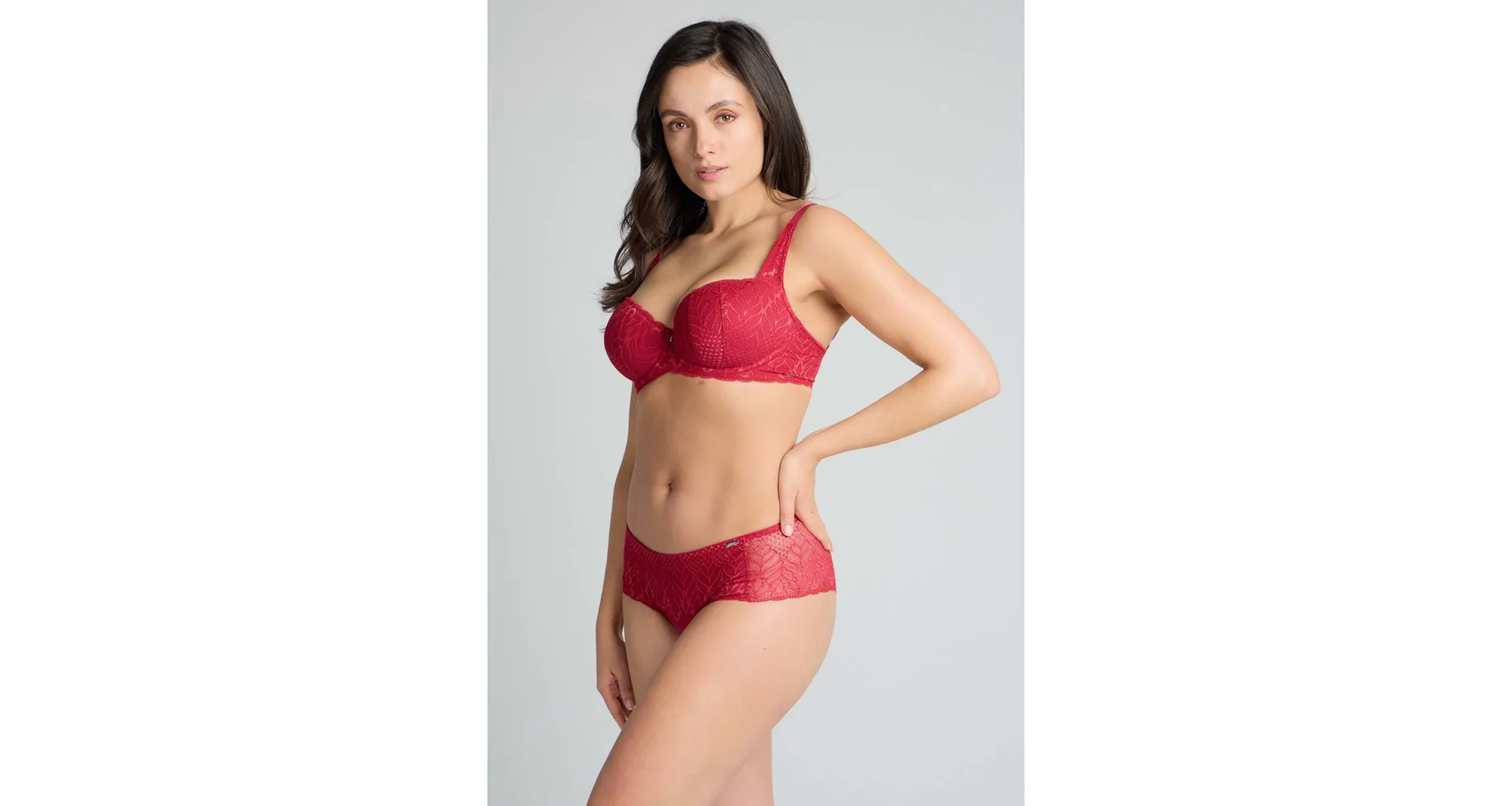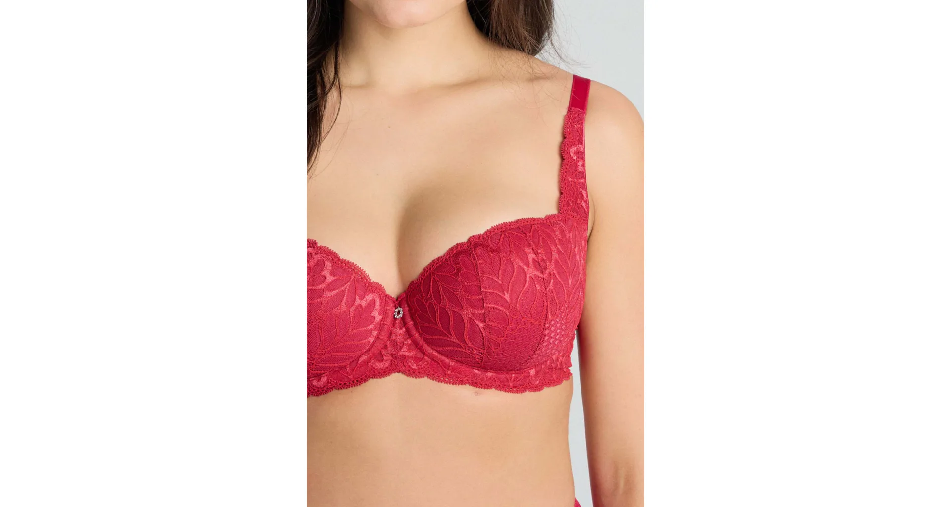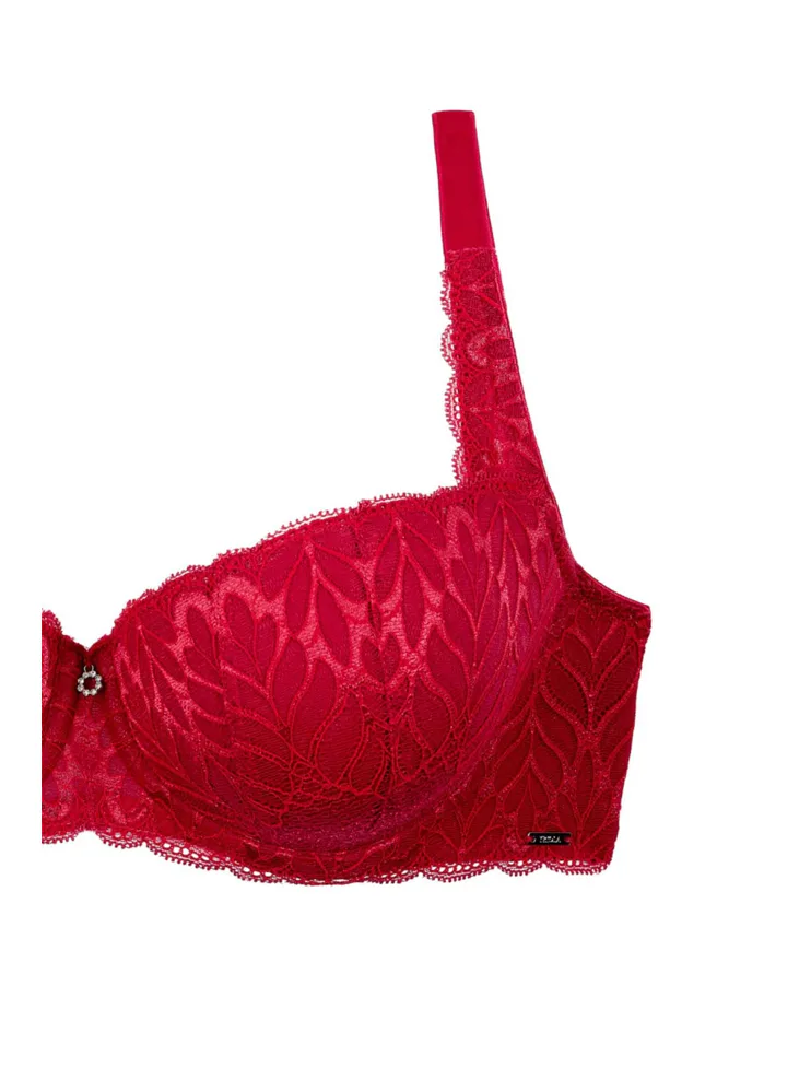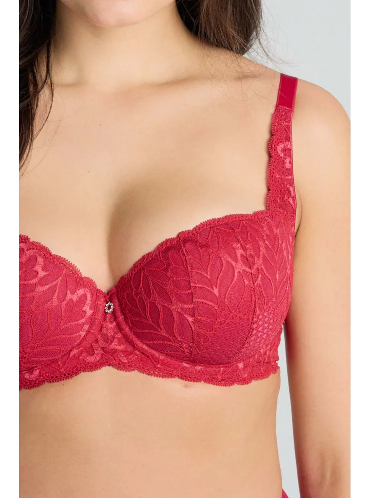 Podprsenka ve střihu balconette vytvoří hluboký a neodolatelný dekolt. Uchvátí luxusní krajkou s bohatým vzorem a temným odstínem červené barvy. Zajistí spolehlivou oporu a přizpůsobí se každému vašemu pohybu. Dokonalá volba pro každý den.