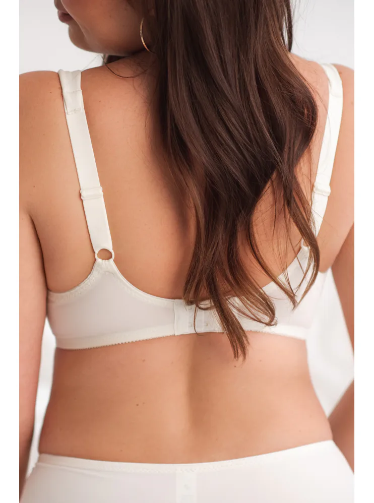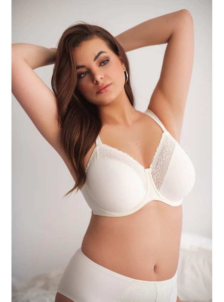 Smetanově bílá podprsenka má zmenšující efekt, ideální pro ženy, které chtějí opticky zmenšit objem prsou. Rozšířená ramínka se nezařezávají a zapínání se nachází vzadu na háčky. Dopřejte si atraktivní zmenšovací podprsenku pro velká prsa.