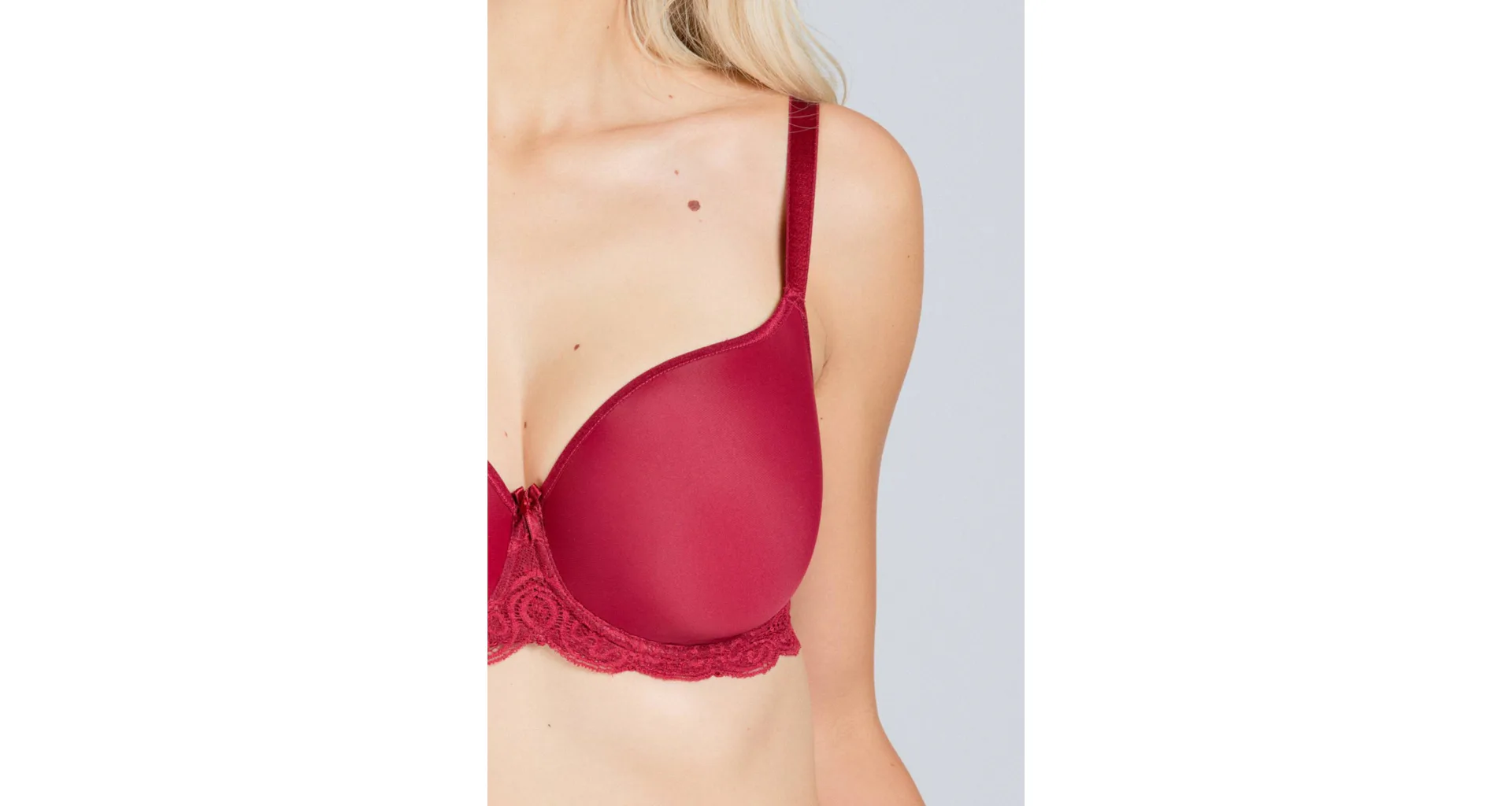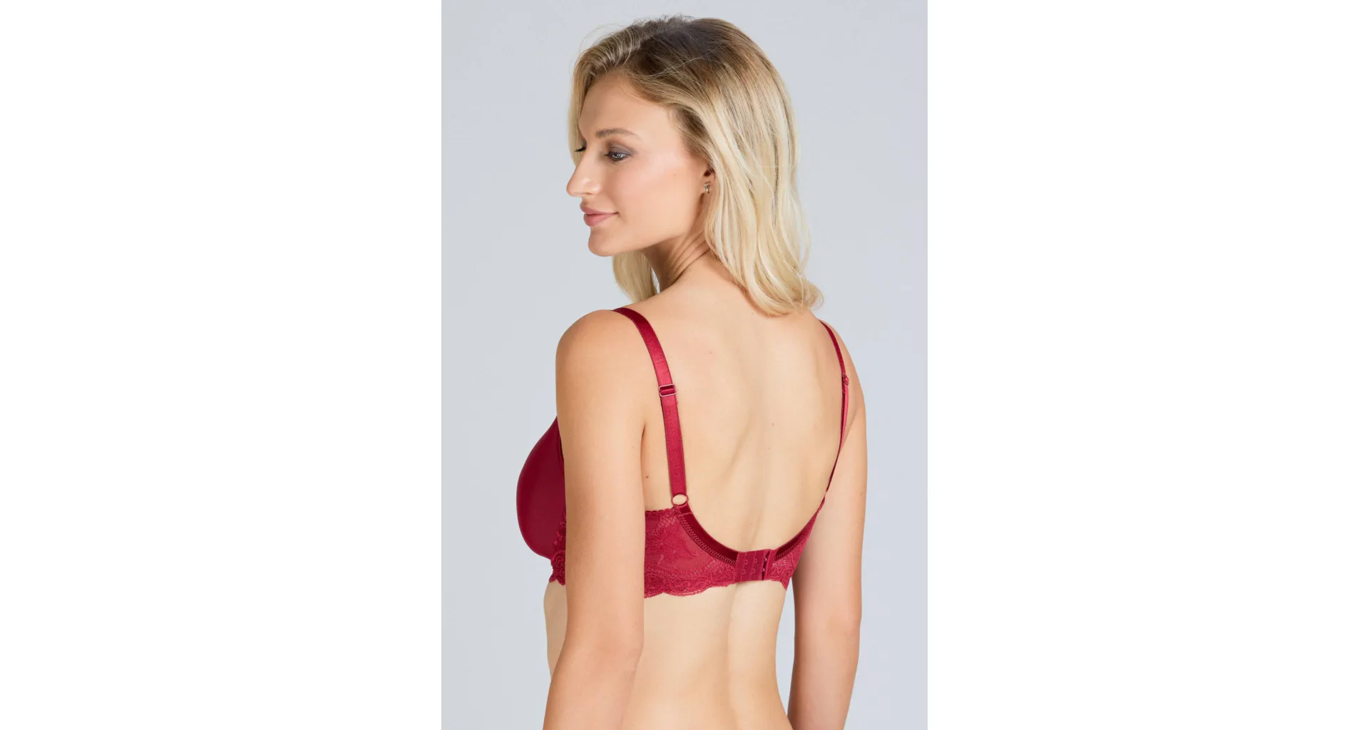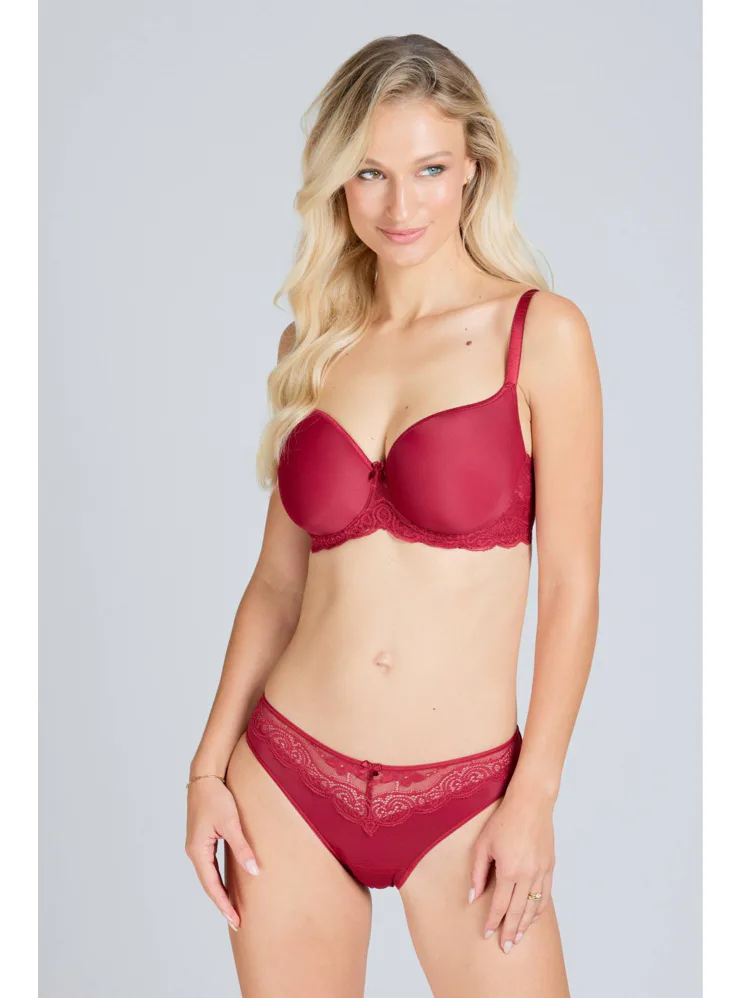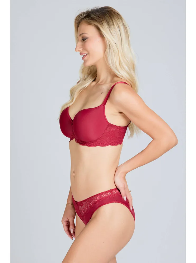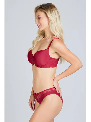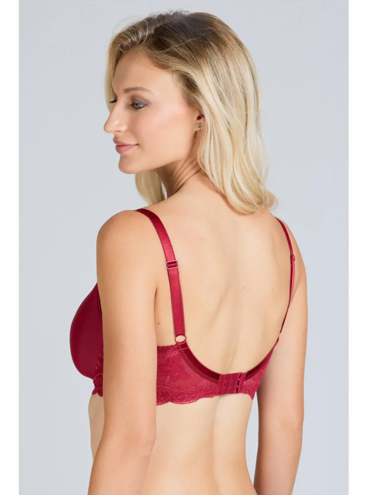 Tmavě červená podprsenka s vyšším středem zafixuje poprsí ve správné výšce. Víte, co je to spacer technologie? Jedná se o inovativní způsob výroby, který umožňuje proudění vzduchu a košíčky se lépe přizpůsobí přirozenému tvaru vašich prsou. Podprsenka zaujme jemnou krajkou v přední i zadní části, která jí dodává romantický vzhled. Má širší nastavitelná ramínka a praktické zapínání vzadu na tři háčky se třemi polohami stažení. Dopřejte si luxus, který si zasloužíte. Doporučujeme ji zkombinovat s krajkovými červenými kalhotkami , které dokonale doplní romantický vzhled podprsenky.