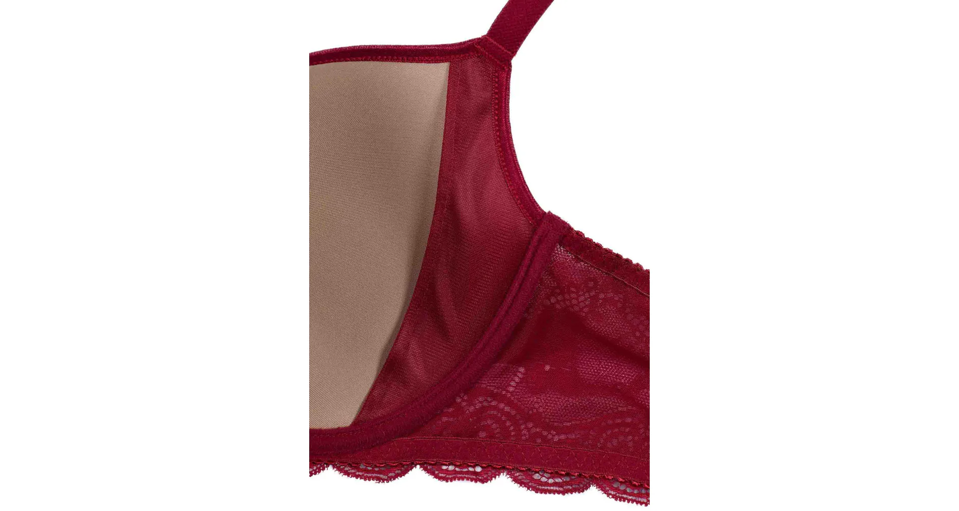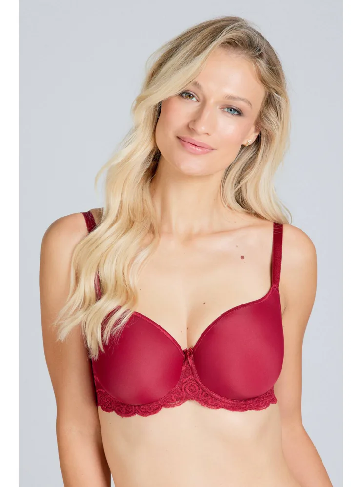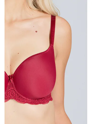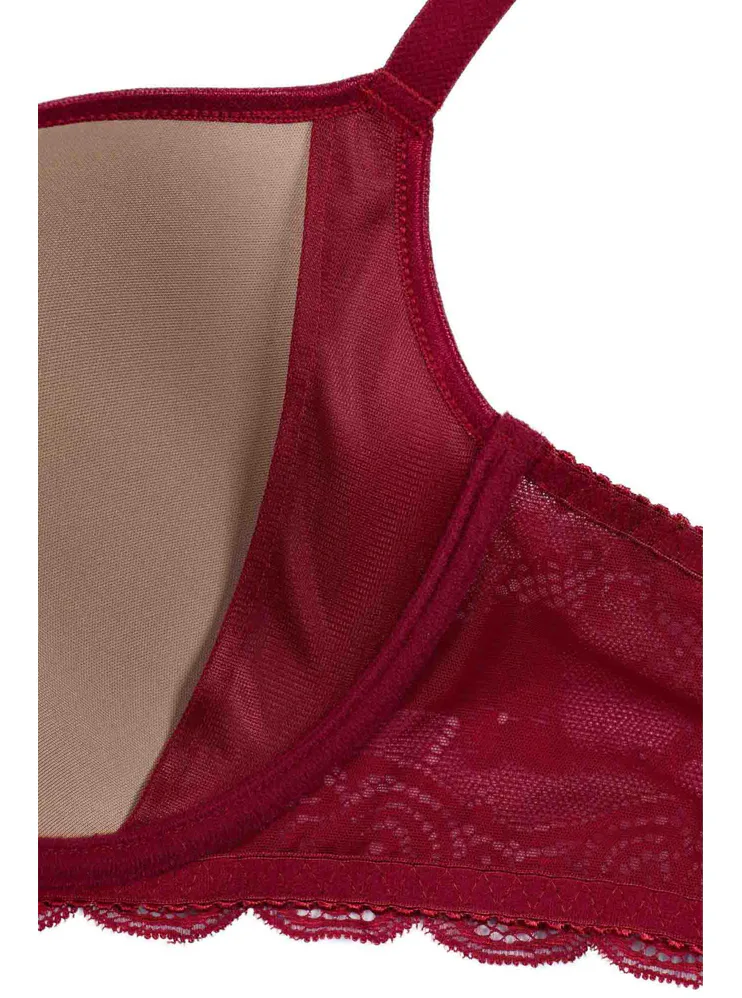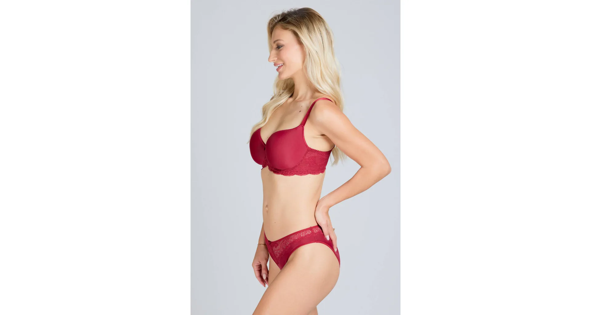 Tmavě červená podprsenka s vyšším středem zafixuje poprsí ve správné výšce. Víte, co je to spacer technologie? Jedná se o inovativní způsob výroby, který umožňuje proudění vzduchu a košíčky se lépe přizpůsobí přirozenému tvaru vašich prsou. Podprsenka zaujme jemnou krajkou v přední i zadní části, která jí dodává romantický vzhled. Má širší nastavitelná ramínka a praktické zapínání vzadu na tři háčky se třemi polohami stažení. Dopřejte si luxus, který si zasloužíte. Doporučujeme ji zkombinovat s krajkovými červenými kalhotkami , které dokonale doplní romantický vzhled podprsenky.